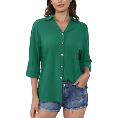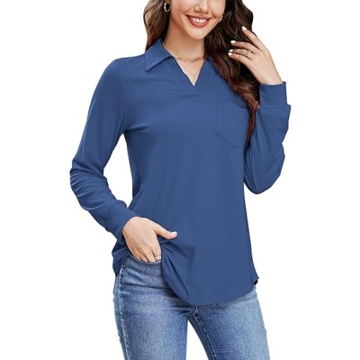 Women's Button Down Shirts Casual Dressy Collared Tops V Neck Classic Long Sleeve Work Office Blouse Tops