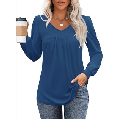 Women's Casual Long Sleeve Tunic Tops V Neck Pleated Shirts Fall Loose Work Blouses