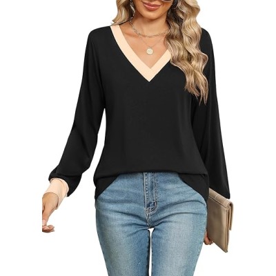 Women's V Neck Tunic Shirts Dressy Casual Color Block Tops Puff Long Sleeve Floral Blouses Relaxed Fit