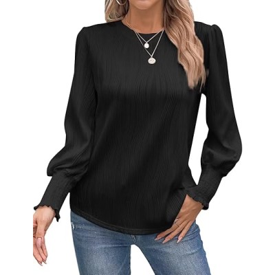 Women Casual Textured Tops Dressy Long Sleeve Solid Shirt Trendy Crewneck Work Blouses