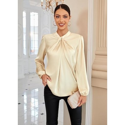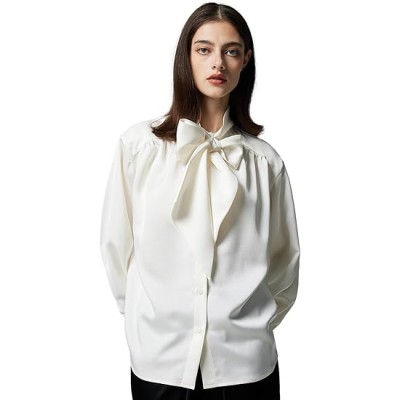 Women's Silk Blouse Long Sleeve Bow Tie Neck Button Down Shirts Casual Office Work Blouse Tops