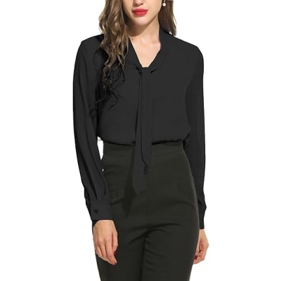 Chiffon Blouses for Women Dressy Bow Tie Neck Long Sleeve Work Shirt Formal Casual Wear