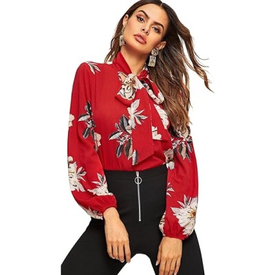 Women's Floral Print Bow Tied Neck Lantern Long Sleeve Blouse Tops