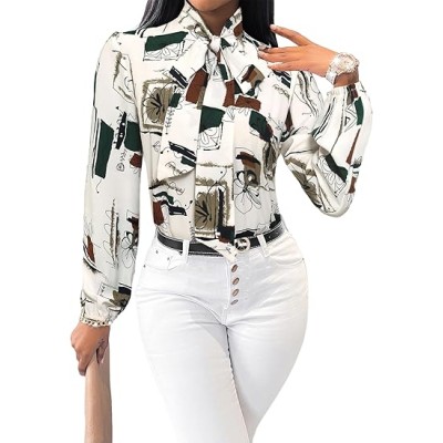 Women's Printed Bow Tied Neck Lantern Long Sleeve Workwear Shirts Blouse