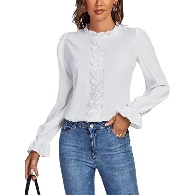 Women's Frill Mock Neck Crochet Long Sleeve Office Blouse Top Shirt