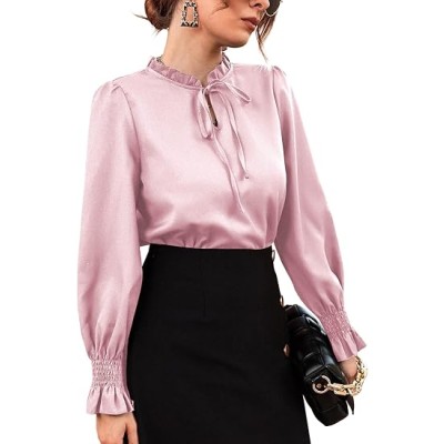 Women's Long Sleeve Peplum Dressy Shirt Office Bow Tie Work Blouses Tops Smocked Waist