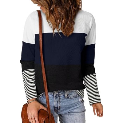 Womens Tops Casual Long Sleeve Shirts Crewneck Color Block Stripes Pullover Waffle Knit Sweater Tops Fall Outfits