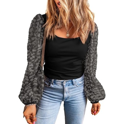 Square Neck Tops Puff Long Sleeve Blouses for Women Dressy Casual Spring Fashion 2024