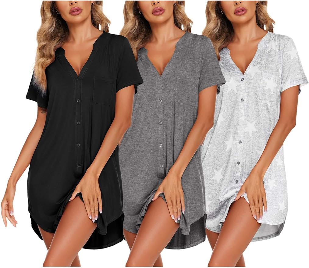 3 Pcak Nightgowns Women Button Down Sleep Shirts V Neck Night Shirts Night Gowns