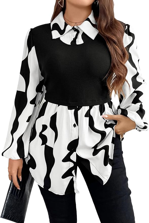 Women's Plus Size Printed Bishop Long Sleeve Shirt Collared Asymmetrical Hem Button Down Blouses