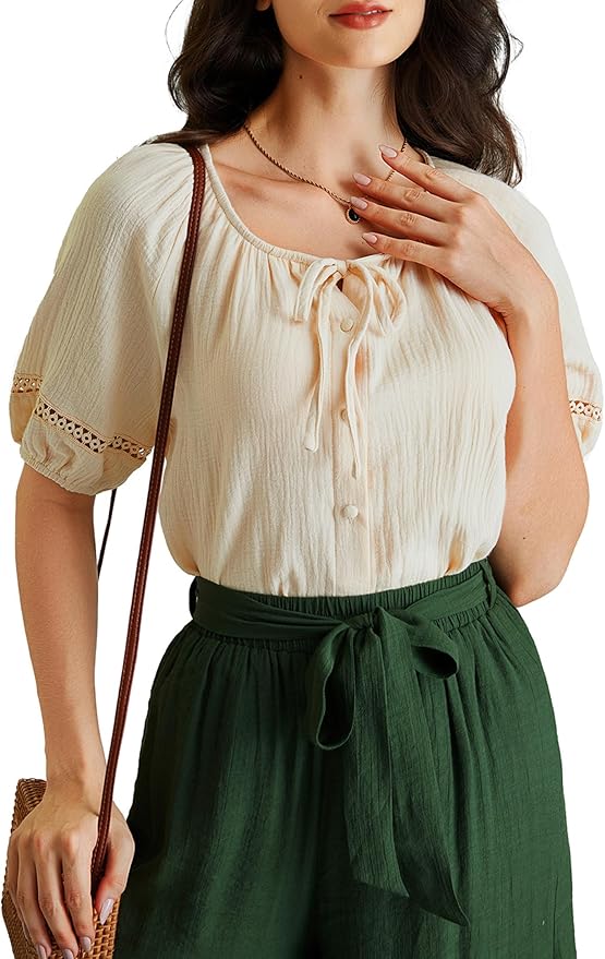 Peasant Blouses for Women Puff Sleeve Top Button Down Boho Casual Renaissance Shirt