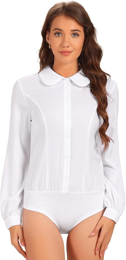 Women's Button Down Leotard Shirt Peter Pen Collar Long Sleeve Business Work Shirt Blouse Bodysuit Tops