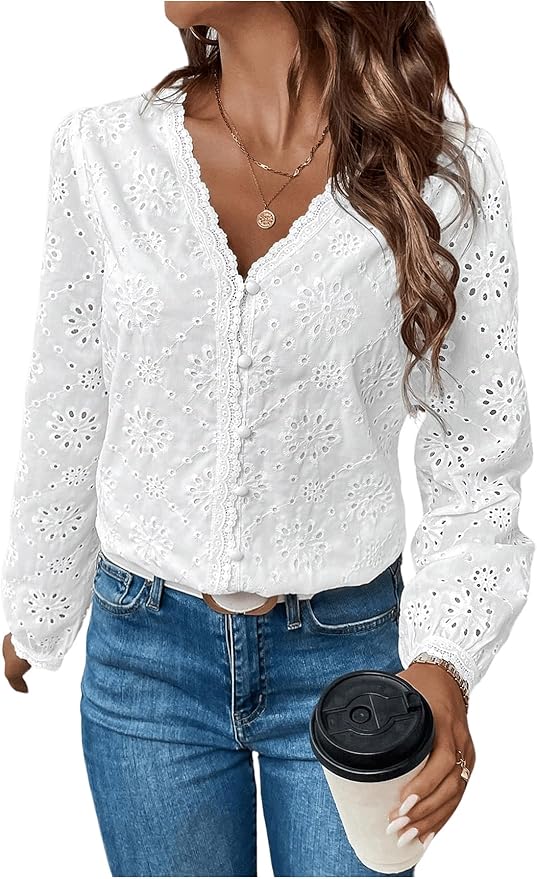 Women's Going Out Tops Eyelet Embroidery Button Down Shirts Long Sleeve V Neck Blouse Tops