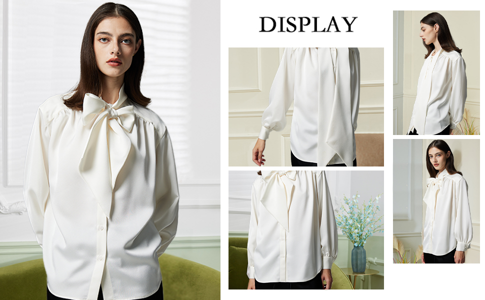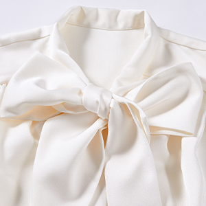 FHMLS Women's Casual Bow Tied Neck Chiffon Blouses Loose Long Sleeve Office Work Solid Tops Shirts