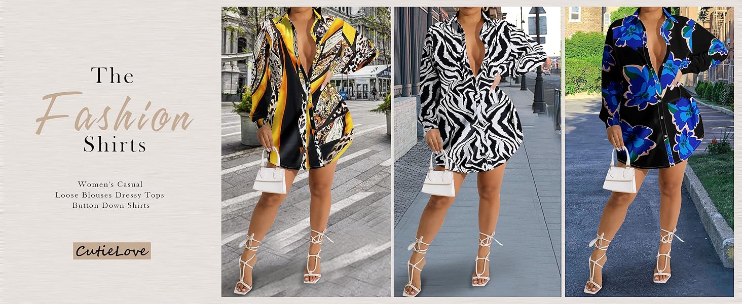Women's Sexy Shirt Dresses Button Down Blouses Long Sleeve Printed Tops