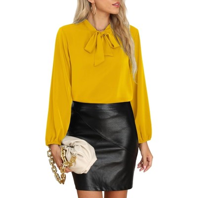 Women's Bow Tie Lantern Long Sleeve Satin Shirts Formal High Neck Work Out Blouses