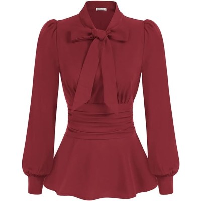 Women's Long Sleeve Peplum Dressy Shirt Office Bow Tie Work Blouses Tops Smocked Waist