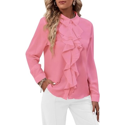 Women's Collar Neck Button Down Ruffle Front Long Sleeve Blouse Shirt Top