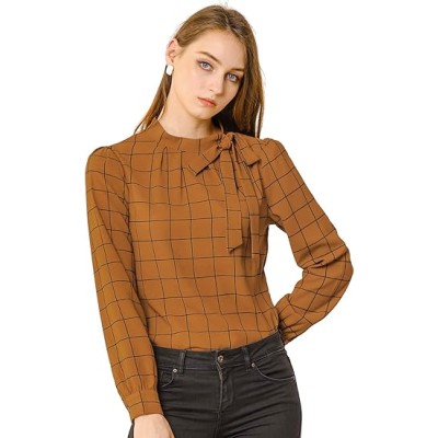 Women's Bow Tie Neck Grid Checks Shirt Office Work Tops Blouses
