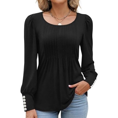 Womens Long Sleeve Shirts Fall Tops Business Casual Blouses Button Pleated Dressy Puff Sleeve Tunic
