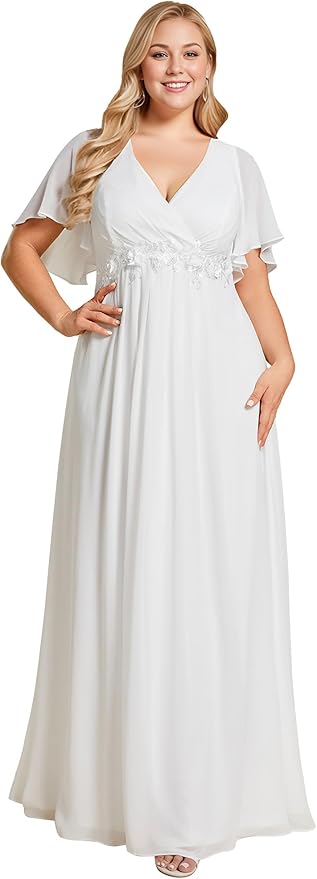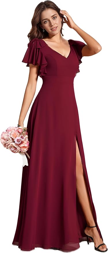 Women's Chiffon Mother of The Groom Dresses V Neck Split Ruffle Sleeves Formal Dresses 02080-PH