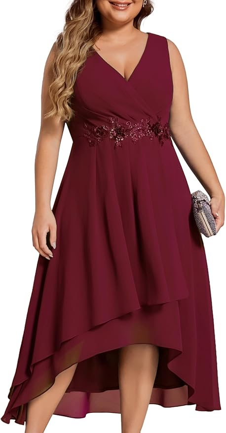Women's V Neck Applique Chiffon Pleated Sleeveless Midi Plus Size Cocktail Party Dresses