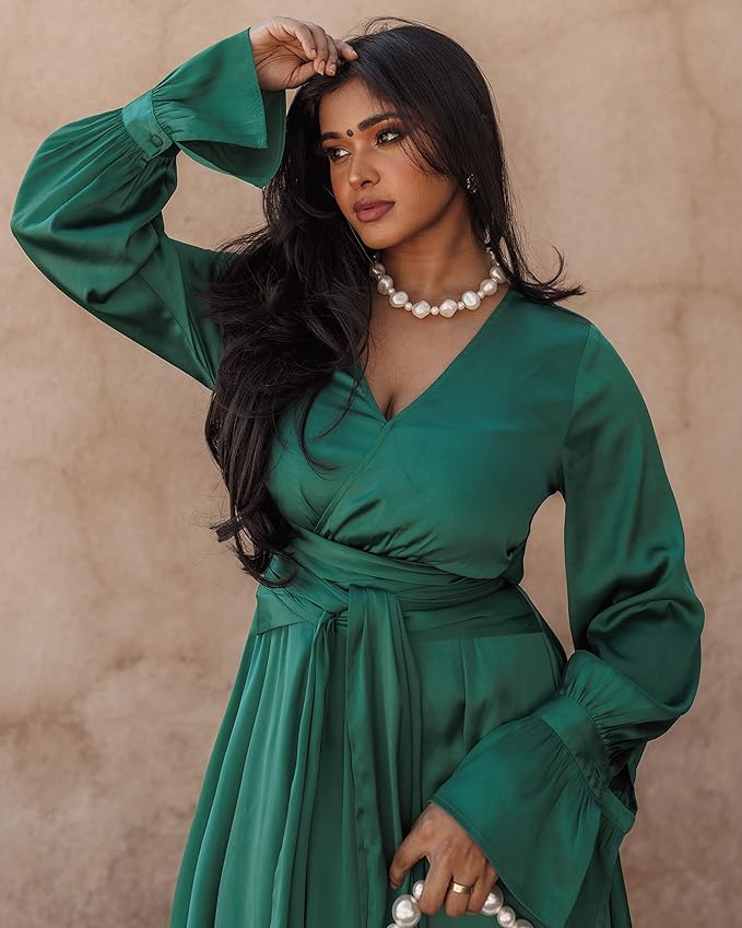 Women's Ultramarine Green V-neck Asymmetric Hem Dress by @sruthijayadevan