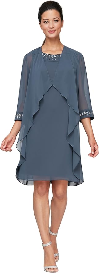 Women's Chiffon Tier Jacket Dress with Beaded Neck and Cuffs