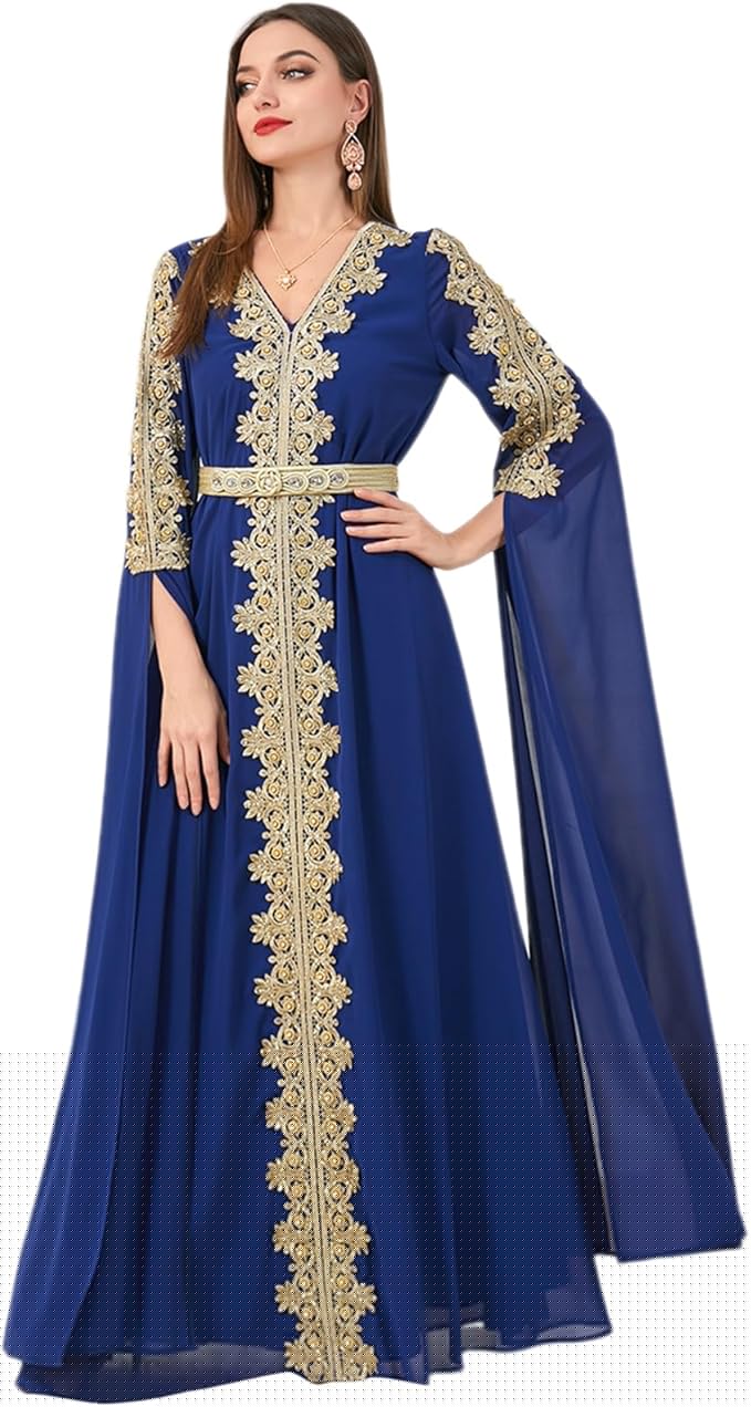 Women Moroccan Kaftan Abaya Golden Lace Dress Embroidered Islamic Ramadan Eid Dress Arabic Dubai Muslim Prayer Robe