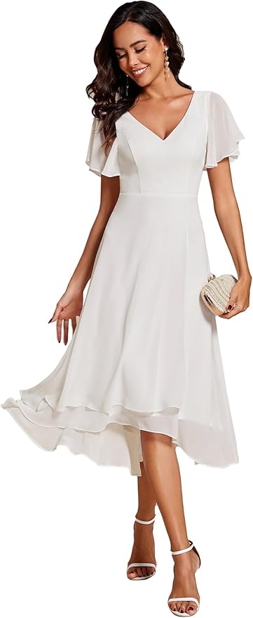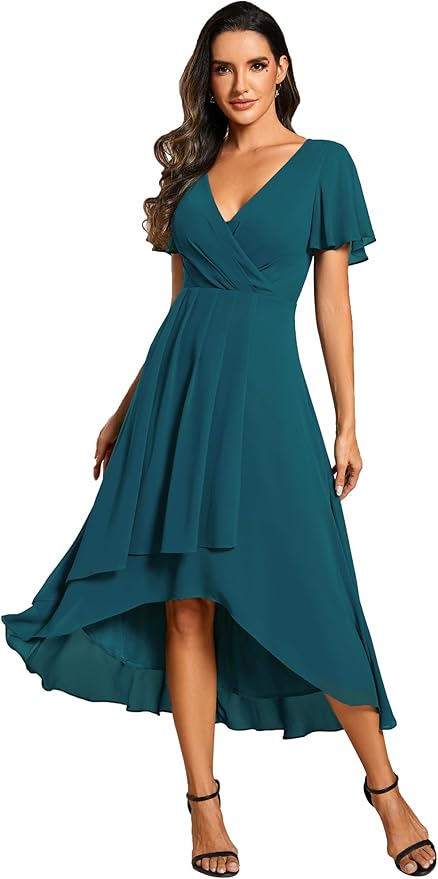 Women's V Neck Ruffle Sleeves Irregular Chiffon A-Line Midi Wedding Guest Dresses 01756