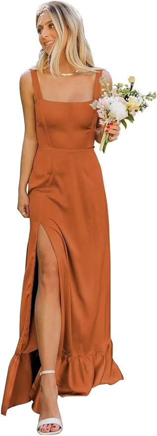 Satin Bridesmaid Dresses Long for Women Square Neck Formal Evening Gowns A Line Wedding Guest Dress with Slit