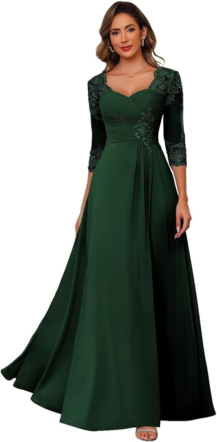 Chiffon Mother of Bride Dresses 2024 Lace Appliques 3/4 Sleeve Formal Dresses A Line Long Evening Prom Dress AU096