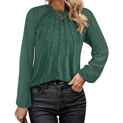 Womens Tops 2024 Fall Fashion Lace Long Sleeve Dressy Casual Blouses Pleated Crewneck Knit Tee Work Shirts