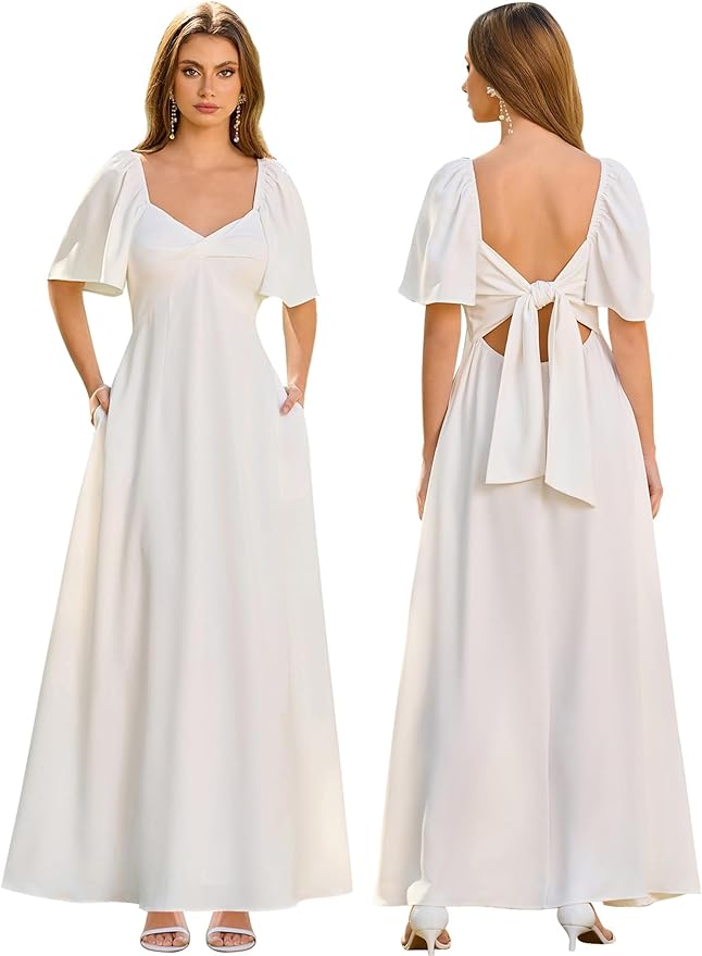 Summer Maxi Dresses for Women 2025 V Neck Short Sleeve Bow Tie Flowy Long Formal Wedding Guest Dress with Pockets