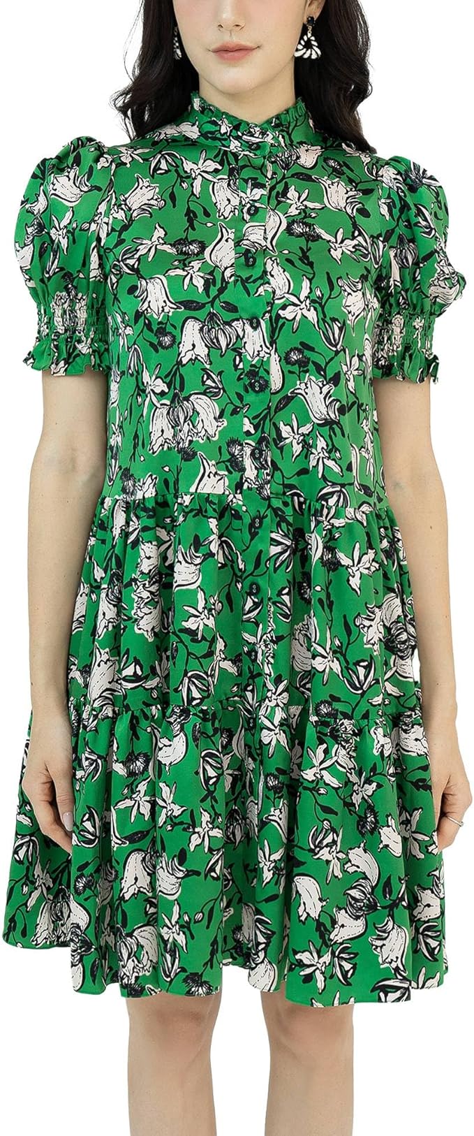 Womens 2025 Floral Midi Dresses Ruffle Empire Waist Elastic Short Sleeve Knee Length Button Closure Casual