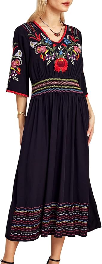 Traditional Mexican Dress for Women Summer Smocking Dresses Vintage Floral Embroidered Flowy Deep V Neck Maxi Midi Dress