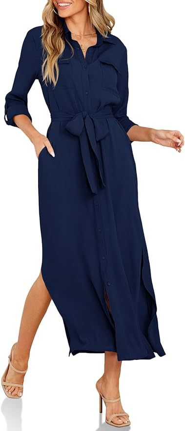 Womens Button Down Shirt Dress Casual Chiffon 3/4 Lenght Sleeve Belted Lightweight Flowy Midi Dress with Slit