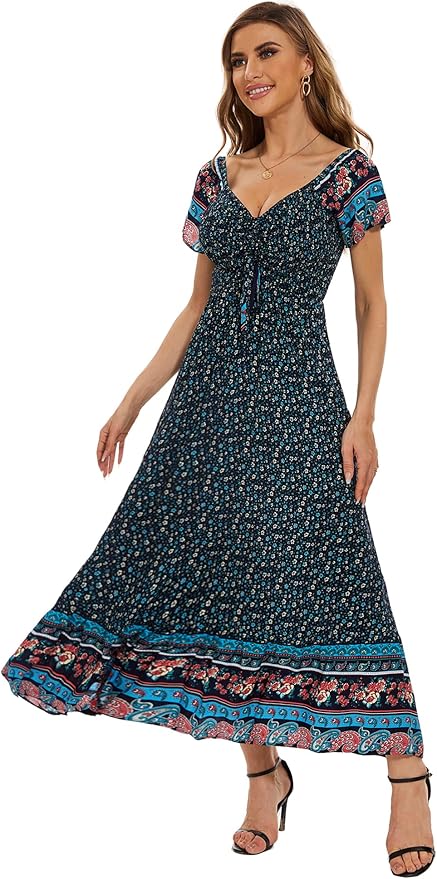 Women's Summer Floral Maxi Dress Casual Short Sleeve Flowy Boho Beach Party Long Dress