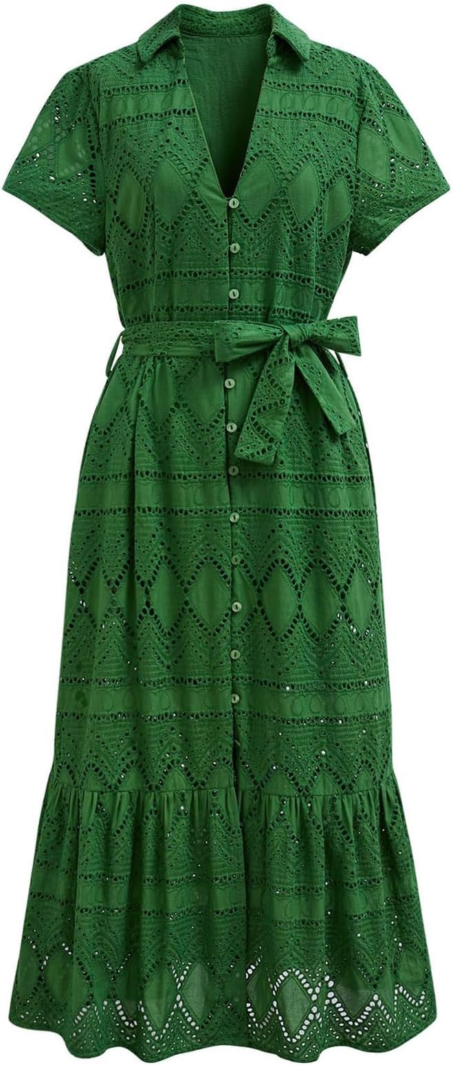 Women Embroidered Eyelet Frilling Midi Dress Cotton V Neck Button Short Sleeve Flowy Summer Green Dress with Belt
