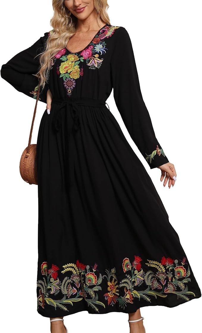 Women Long Sleeve Embroidered Mexican Dress for Fall Spring Peasant Traditional Floral Boho Smocked Maxi Dresses