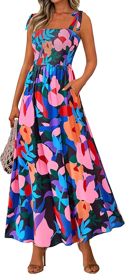 Womens Summer Dresses Floral Sleeveless Smocked Maxi Dress Boho Spaghetti Strap A Line Flowy Beach Long Sundress