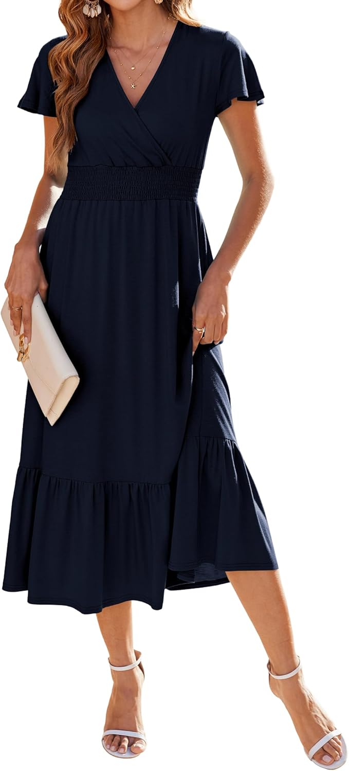 Women Dresses Summer Casual Midi Dress Wrap V Neck Swing Ruffle Short Sleeve A-line High Waist Tiered Long Dress