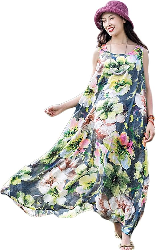 Women's Summer Sleeveless Bohemian Floral Printed Maxi Dress Casual Long Beach Dress with Pockets