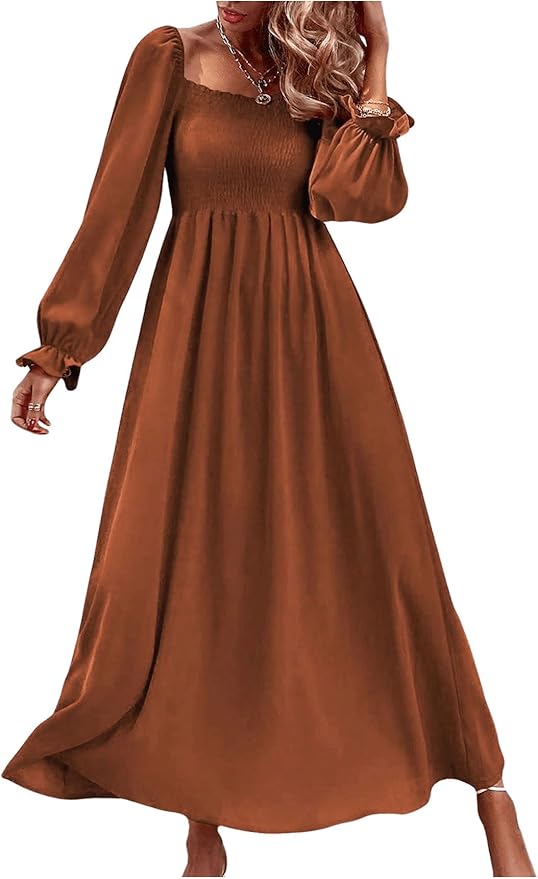 Women's Boho Square Neck Smocked Long Puff Sleeve A Line Maxi Dress
