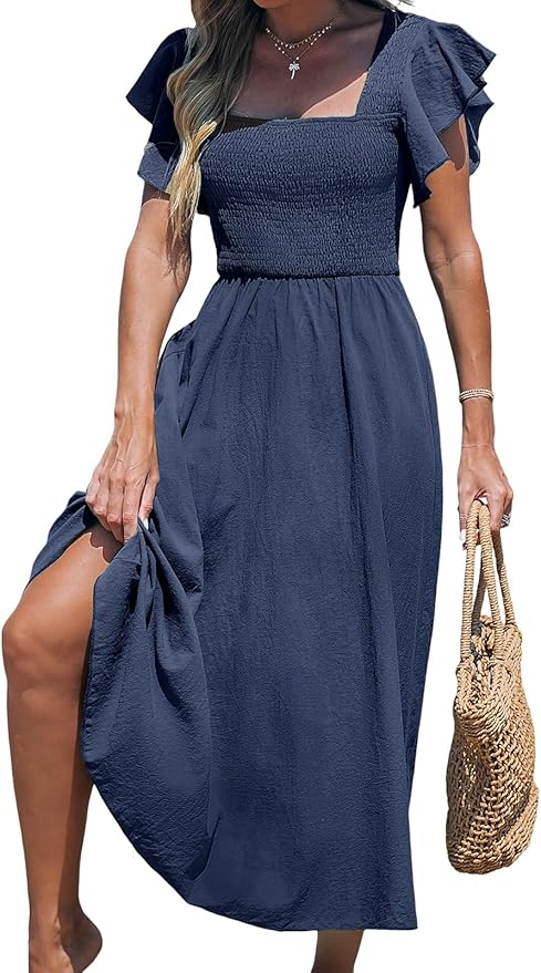 Women's Summer Dress Square Neck Striped Smocked Dress Ruffled Cap Sleeves Dress A Line Maxi Formal Dress